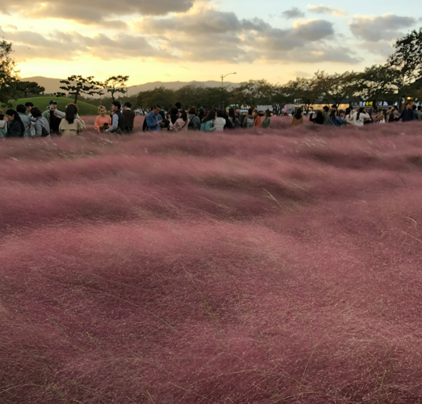 첨성대가 자리한 월성지구 주변에는 이제 막 핑크 뮬리가 피어나고 있었고 특유의 분홍빛 아름다움을 뽐내고 있었어요.