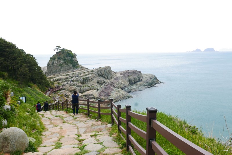 거제도 신선대로 향하는 산책로의 우측으로는 몽돌해변이 펼쳐져요. 한번쯤 걸어보는 것도 괜찮게 느껴지는 몽돌해변인데요. 거제도 신선대 전망대에서 바라보면 바위 위에 우뚝 솟아 있는 바위 하나가 눈에 띄었습니다.