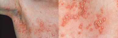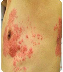 대상포진 증상은 피부 한곳에 심한 통증과 함께 발진과 수포(물집)들이 생깁니다. 보통 물집은 신경을 따라 몸 한쪽으로 띠 모양으로 분포되어 오른쪽 또는 왼쪽에만 증상이 나타납니다.